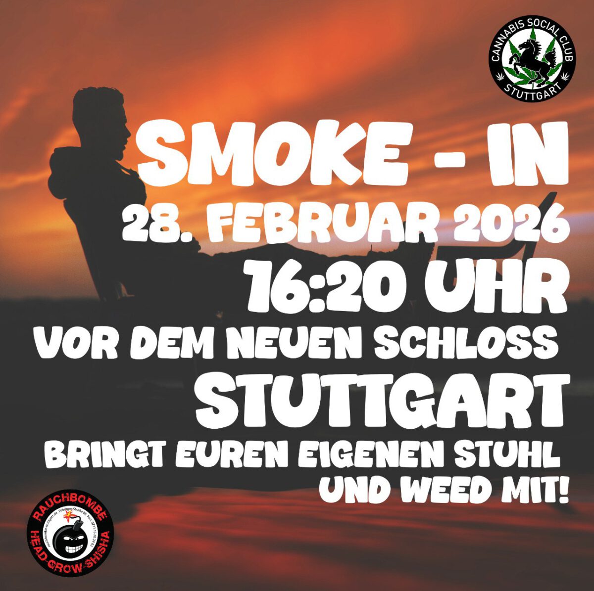 Am Samstag den 28. Februar 2026 werden wir anlässlich der Landtagswahl einen Smoke-In auf dem Schlossplatz vor dem Neuen Schloss abhalten.